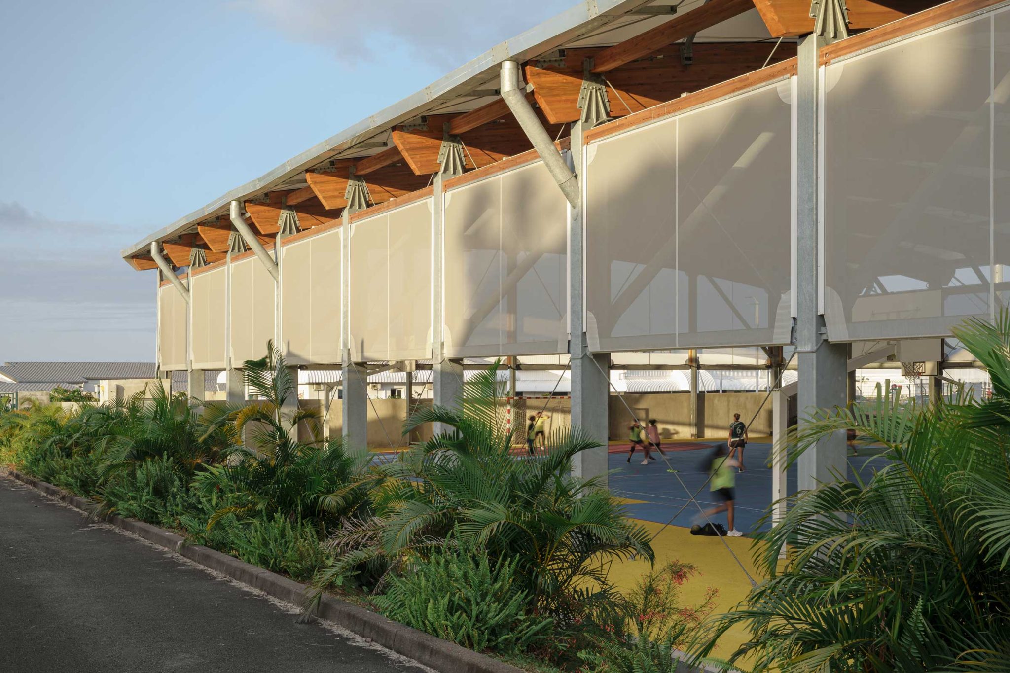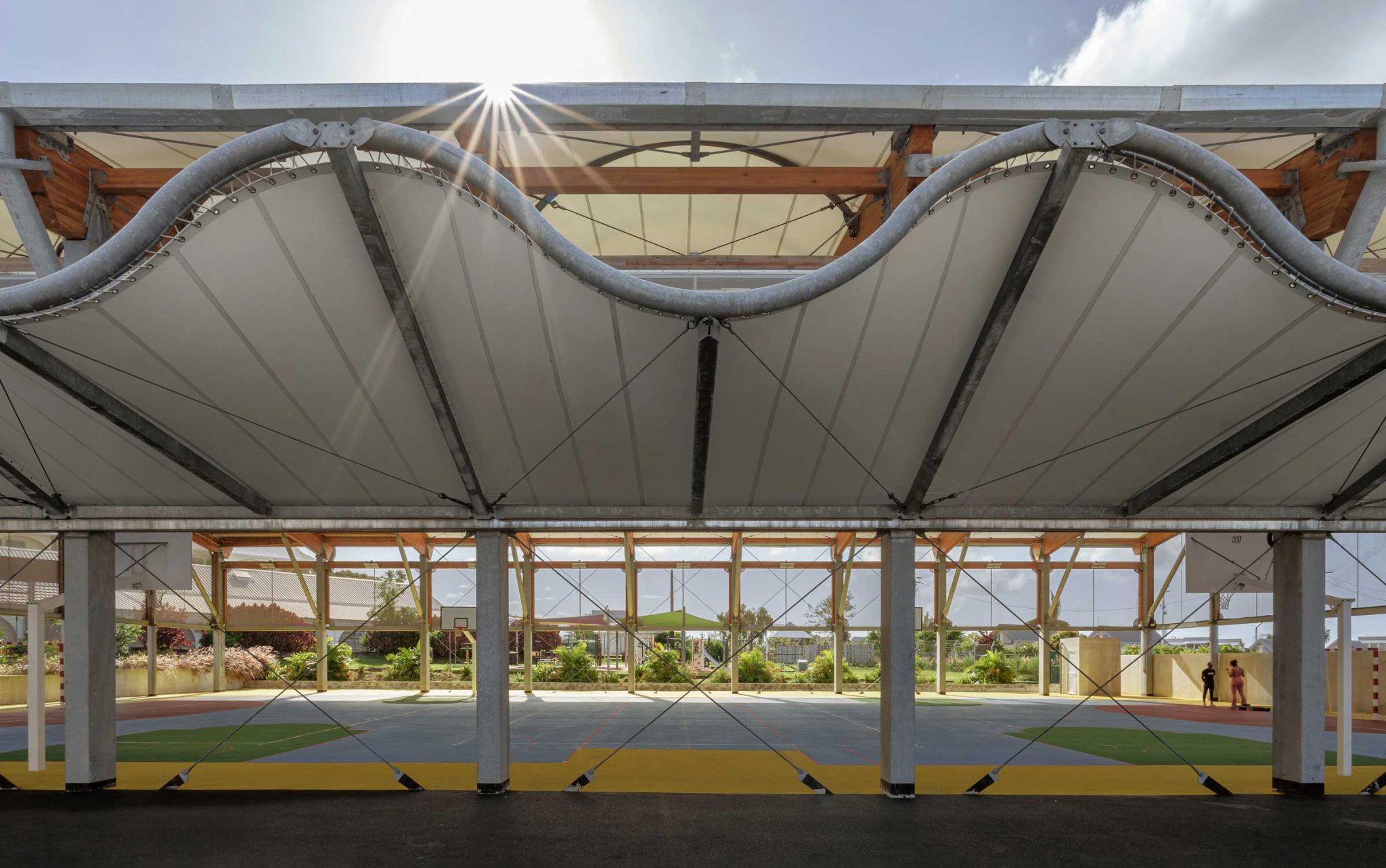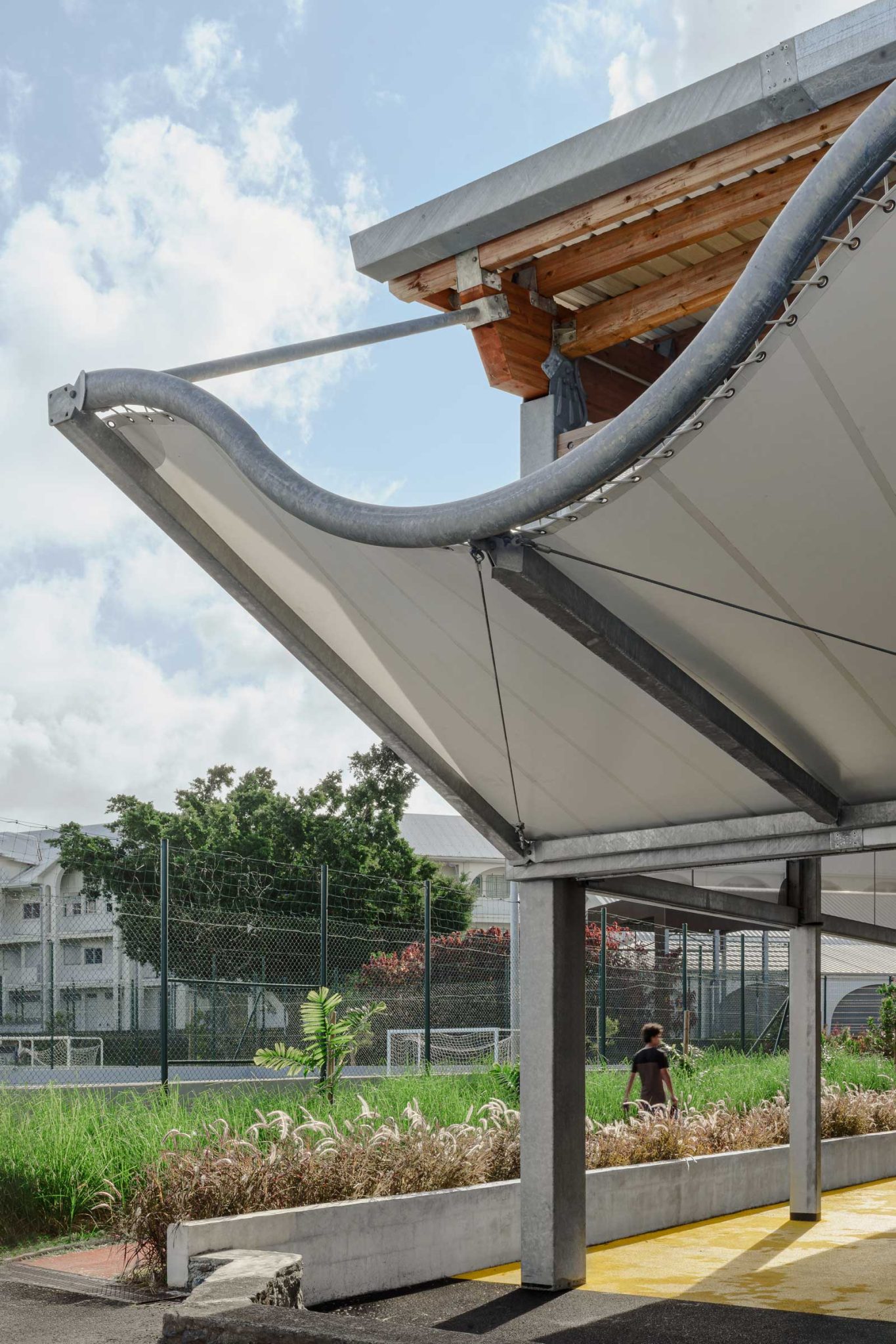 la halle se compose d’une ossature métalo bois, couverture textile et bardage textile.