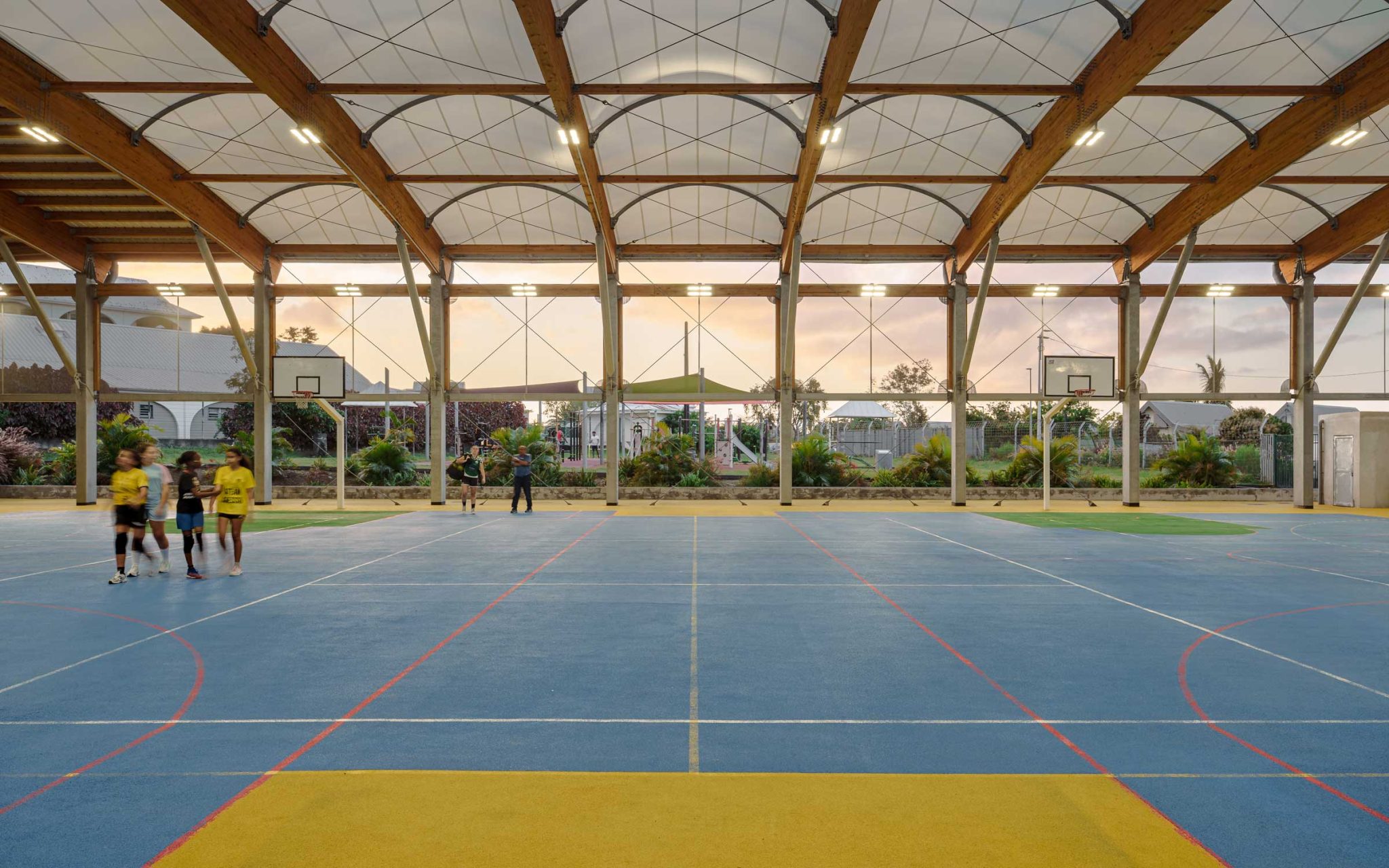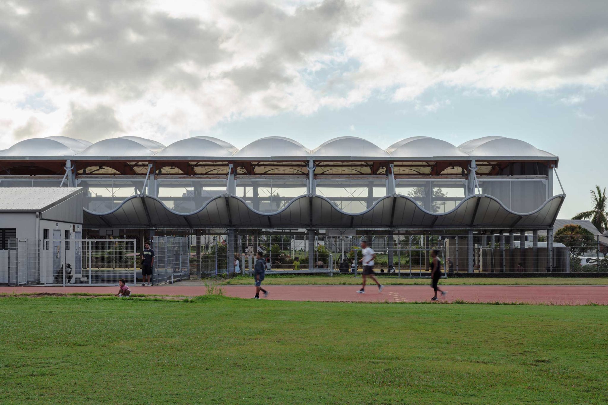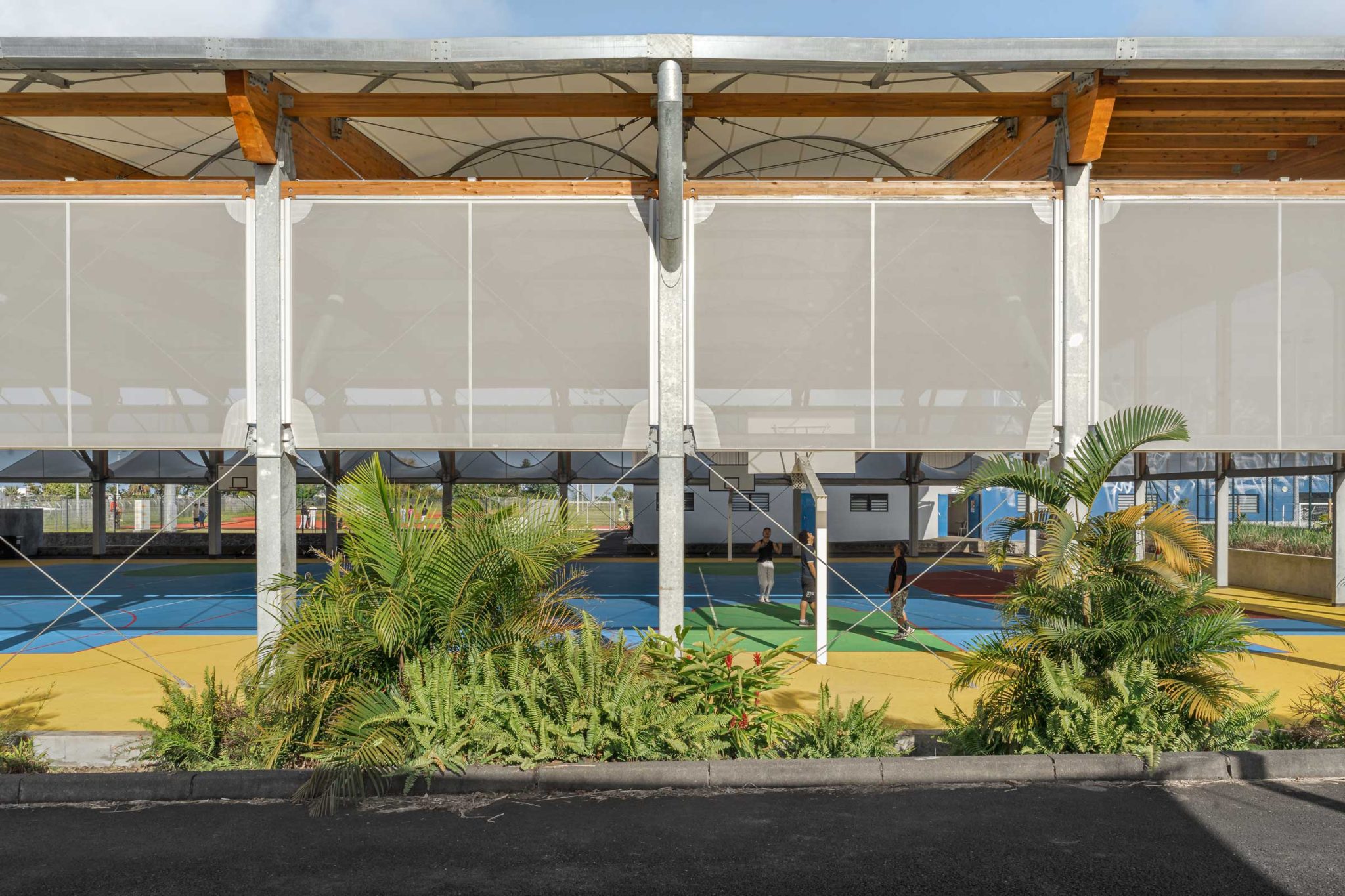 la halle se compose d’une ossature métalo bois, couverture textile et bardage textile.
