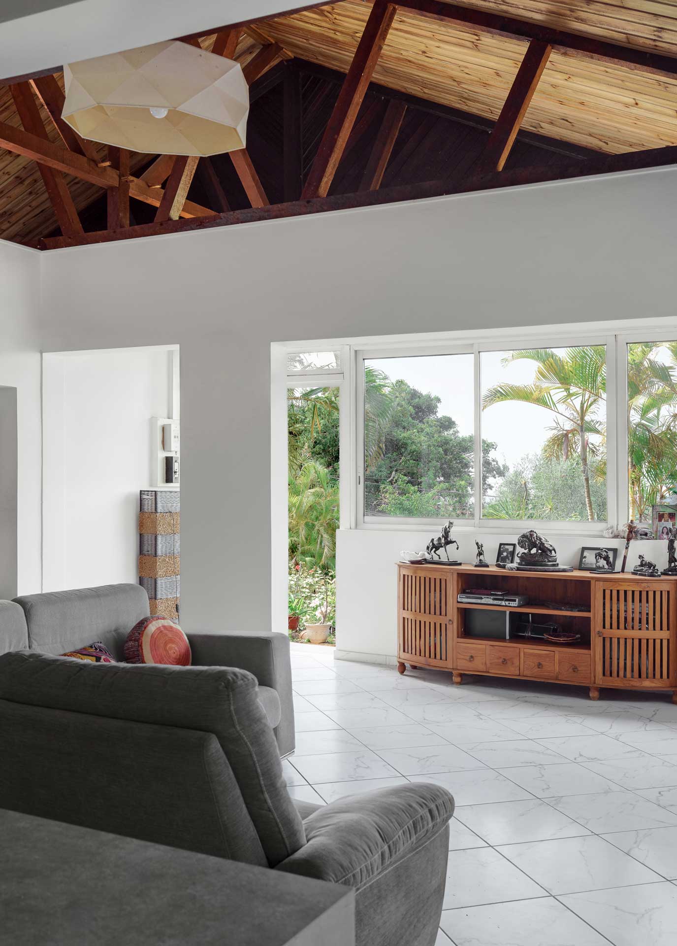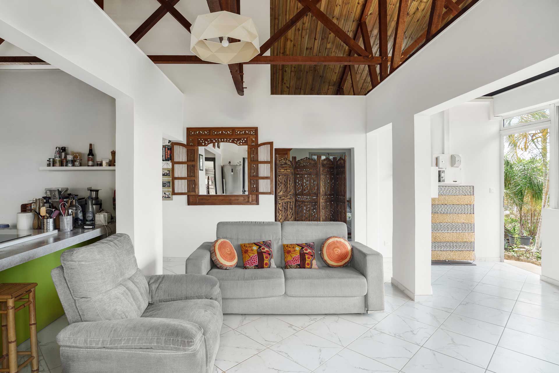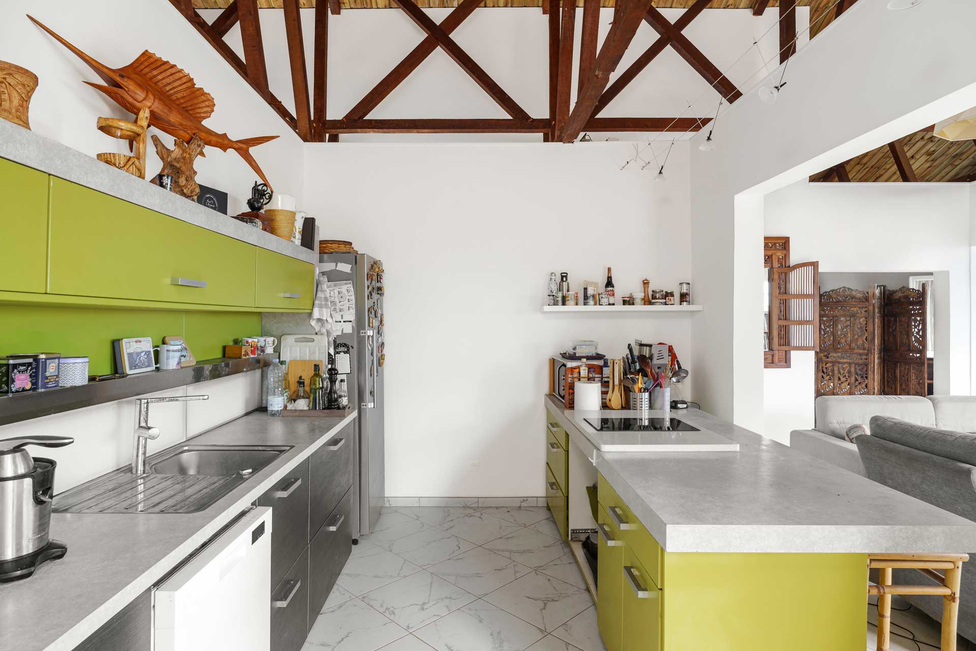 une maison existante bien réalisée, une belle charpente de style péi en bois.